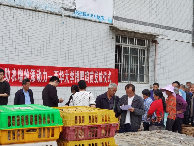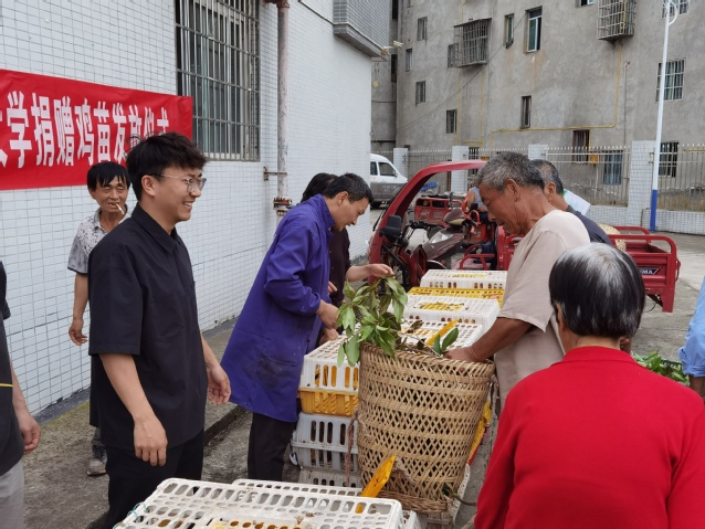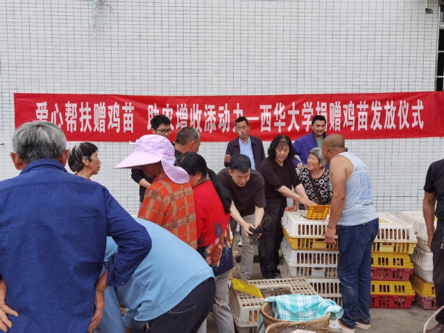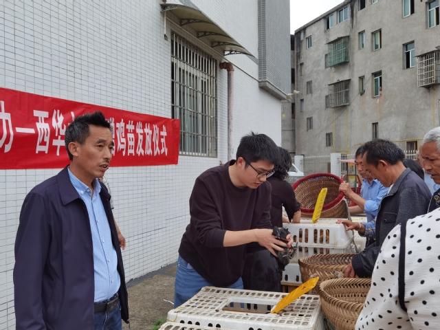 5月10日,学校定点帮扶的嘉陵区龙蟠镇水堰口村村委办公室外格外热闹,小鸡的叽喳声、村民的欢笑声交织成一片。“鸡苗马上到了,大家排好队,先签字后领取!”