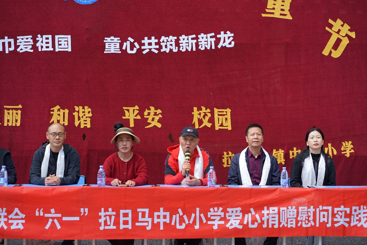 捐助活动现场 随后,重庆大学泸州校友会执行副会长严强代表四所高校校友会,向拉日马镇中心小学全体师生表达了美好祝愿,并祝福孩子们“六一”儿童节快乐!勉励大家努力学习、天天向上,长大做一个对国家、对社会、对自己美丽家乡拉日马有用的建设人才。