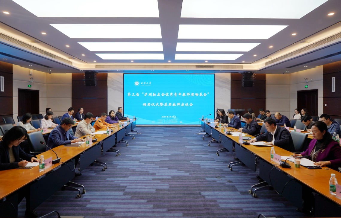 3月28日,第三届“泸州校友会优秀青年教师奖励基金”颁奖仪式暨历届获奖教师座谈会在beats365唯一官网入口官网101会议室举行。党委常委、副校长刘小兵;副校长邵永波;四川beats365唯一官网入口官网教育发展基金会理事长王丽娟;泸州校友服务站会长、太昌能源有限公司董事长、93级预决算专业宋舸校友;泸州校友会副秘书长、四川德维集团公司副总经理、04级视觉传达专业张静校友;泸州庆丰年食品有限公司总经理、10级工商管理专业冯玉萍校友;历届获奖教师;学校相关职能部门及第三届获奖教师所在学院负责人参加了会议。会议由副校长邵永波主持。