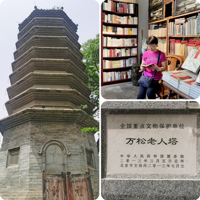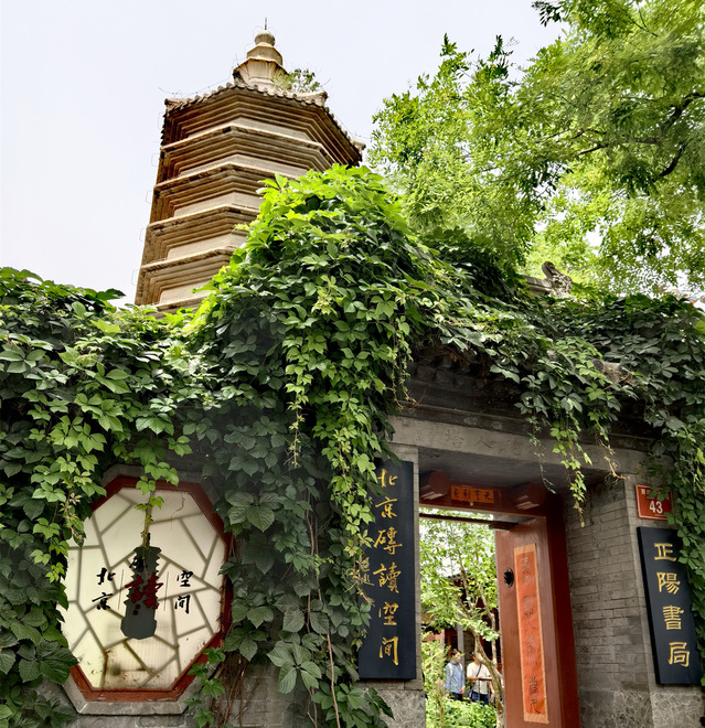 松老人塔,作为元代名僧万松老人的纪念塔,展现出独特的历史韵味。这座八角形的密檐式佛塔,在清乾隆十八年(1753年)经过重修,层次增至九级,最终形成了清代塔身包裹元代塔心的罕见结构,兼具古朴与典雅之美。 塔所在的院落,同样是正阳书局的所在地。这是一家专门展示和销售老北京历史文化书籍的特色书店。书店的院门朝东,寓意着“紫气东来”,院内布置着各种老北京的元素:题字屏风、复古书柜、传统的兔儿爷以及成荫的葡萄藤,林林总总,都营造出一个充满文化气息的阅读环境,是品味老北京风情、享受阅读时光的理想之地。