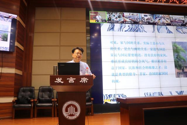 嘉陵区教体局党组书记、局长杨宇致辞 在讲座中,潘殊闲教授以《苏东坡:家风熏育下的家国情怀与民本思想》为题,从家与国、民与本的逻辑关联讲起,探讨苏氏家教与苏氏家风,进而阐述苏轼的家国情怀。潘殊闲教授说,苏氏家教有书香苏家、因材施教、正能量教育、笃孝爱敬、宽以待人、乐善好施、为人低调等内容,苏氏家教更多是身教,是一种道德文章的积淀与熏染,是崇教、崇礼、崇仁、崇义的具化与践行。而苏氏家风是三苏前后几代在家庭内部形成的一种具有苏氏特色的为人、为事、为生、为学、为家的风格与风尚,如崇尚读书学习、追求上进、仁厚之心等。