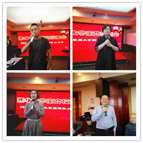2016级汉语言文学专业何箐和李欣玲校友代表新校友发言 老校友代表讲话中的热情欢迎、亲切叮嘱和悉心鼓励让校友们倍感温馨。1979级材料专业校友刘文川就“求是、明德、卓越”的母校校训分享了自己的感受:回想起当年在母校求学的时光,母校给与我们良好的校园氛围、严谨的治学风气,赋予了我们踏实求学、追求进步的品格,这些都无不体现了母校的校训和精神,他还为大家诵读了自己《祎做红尘明白人》的韵文表达对母校和校友们的祝福。2001级美术专业校友粟高华说到,我们的一生都有一段时光在同一个校园里写下过各自的诗篇,无数个青春岁月在母校交融重演,这是非常珍贵的缘分,她叮嘱校友们要保持良好的身心状态、不忘初心秉承西华精神,做一个脚踏实地、坚持目标、努力实现自我梦想的人,同时希望大家能多多参加校友会的活动,加强联络和交流。2011级工商管理专业校友伏天义通过在校取得的法学双学位毕业证书,目前就职于律师事务所,他说到,在母校获得的学习和锻炼机会,让他有机会在激烈的竞争环境中通过第二学位的学习经历和个人的综合素质能力,就职于自己喜欢的行业,在感恩母校培养的同时,他也真诚祝愿母校的明天更加辉煌。