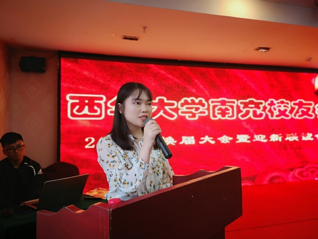 南充校友会新一届会长赵燕辉校友致辞 王丽娟主任就校庆前期筹备工作开展情况,近期举办的校友捐赠仪式、成渝地区双城经济圈校友企业家联盟筹备会、10月17日前后校庆活动的安排和六十周年云校庆工作思路等,向校友们介绍了学校建校六十周年校庆筹备工作。同时,她还介绍了校友总会从2009年成立至今,在联络校友、服务校友、助力母校、各地校友会开展工作情况、校友们对母校支持等方面的情况。她介绍到,为迎接学校建校六十周年校庆,各地校友会积极通过现金捐赠、实物捐赠、为校庆定制贺礼、合作共建等方式为母校建校六十周年献礼。南充校友会赵燕辉校友也将与母校共建社科研究基地,她希望在座的南充校友积极为母校与地方政府、企业事业单位的合作牵线搭桥。在感谢南充校友会历届理事会成员对母校校友工作辛勤付出的同时,她祝愿南充校友会工作开展得越来越好,并欢迎校友们通过网络云祝福、云校园、云捐赠等方式参与校庆活动,表达对母校的祝福。