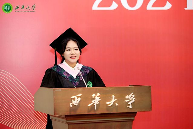 毕业生李林锋发言 2021级研究生毕业生代表、省级优秀毕业生张雪莹由衷地表达了对学院真切关心、老师不倦教诲、父母无私养育、朋友一路陪伴的感激,并向未来的自己宣誓:“无论身处何方,都将以最佳的状态,去迎接生活中的每一个挑战,怀抱梦想、脚踏实地,做一个有理想、敢担当、能吃苦、肯奋斗的新时代好青年,让青春在全面建设社会主义现代化国家的火热实践中绽放出绚丽之花。”