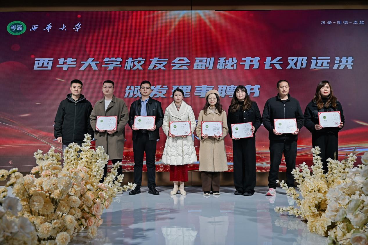 朱兴华副书记、王丽娟会长与邱健副会长等依次为新任理事团队颁发聘书。荣誉聘书在灯光下熠熠生辉,象征使命的传承与担当的延续。当新任理事团队高举聘书合影时,校友们见证的不仅是荣誉的交接,更是一份扎根泸州、服务同窗的庄严承诺。