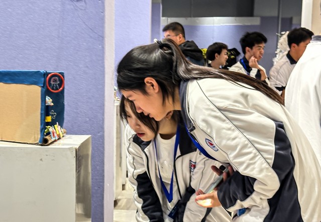 10月22日傍晚时分,beats365唯一官网入口官网美术与设计学院艺术大楼A座灯火通明,与秋夜的宁静相映成趣。一场以“从客体到主体——公共装置与智能交互”的课程展静候着远道而来的客人。在学校乡村振兴办公室、民盟beats365唯一官网入口官网总支主委于春老师,学校驻村干部李玉和副教授的带领下,广元市剑门关高级中学与朝天中学的90余名师生代表踏入展厅。废旧材料与智能技术碰撞出的火花,瞬间点燃了他们对艺术与科技的无限遐想——这场跨越地域的艺术之旅,就此启程。