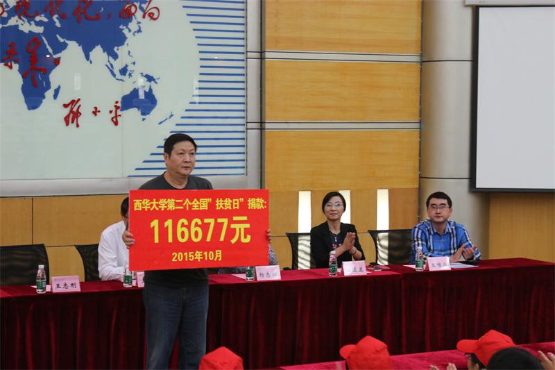 启动仪式会场 今年的10月17日,是世界第23个消除贫困日,也是我国第二个扶贫日。10月13日,学校组织全体教职工开展了一次“扶贫日”捐款活动,31个机关部门、22个学院共计捐款金额为116677元。此次扶贫募捐的全部款项将打入我校精准扶贫对象——南充市嘉陵区石楼乡马达山村财政所的专用帐户,用于村上道路和小微水利等公共设施的修缮和改造以及精准扶贫的7户贫困户进行产业扶持、结对助学等事项。地方合作与服务处处长王志刚代表学校进行了捐赠。