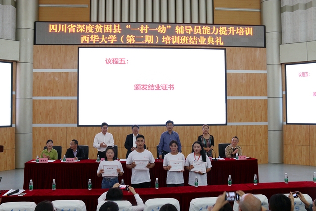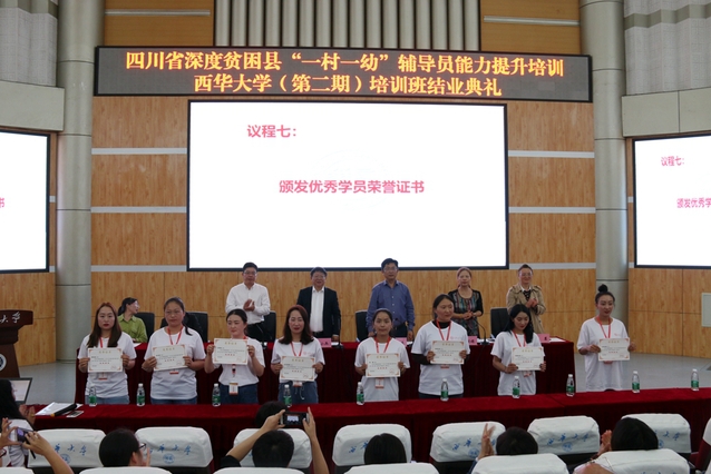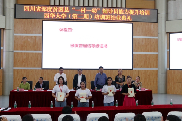 会议现场 本次培训按照四川省教育厅《2019年深度贫困县“一村一幼”辅导员能力提升培训工作方案》的安排,通过集中系统培训和跟岗学习等形式,帮助“一村一幼”辅导员熟练掌握运用标准普通话和保教专业技能,形成正确的教育观、儿童观和良好的师德师风,切实提高“一村一幼”幼教点保教保育和管理水平,让学前儿童“学好普通话、养成好习惯”。学校高度重视本次培训工作,结合学员实际情况和学校相关专业学科资源,统筹协调郫都区幼儿园跟岗学习点,通过专家讲授、跟岗学习、问题研讨、经验分享、课例展示、技能训练等形式,组织开展了本次培训工作。 会上,航空航天学院党委书记徐元彬对本次培训的主要特点、成效及存在的不足进行了总结,希望各位学员以此次学习为契机,切实提升个人能力,并以此次培训为起点,养成持续学习、终身学习的好习惯。与会领导为参训学员代表颁发了普通话等级证书和结业证书,学校扶贫办主任王丽娟宣读了对优秀学员的表彰决定,并为80名优秀学员颁发荣誉证书。