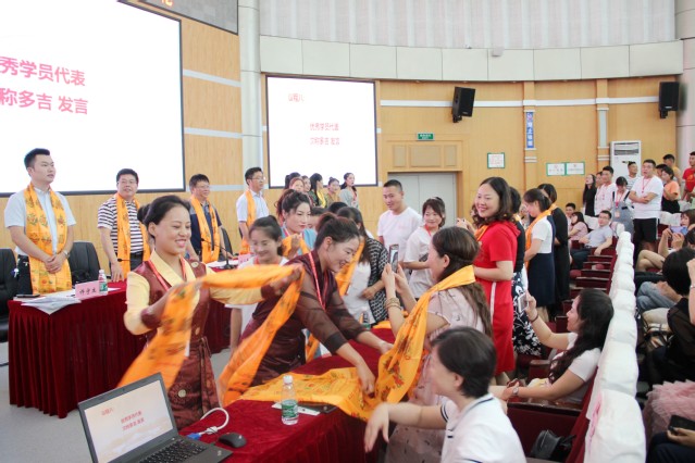 颁发荣誉证书 培训参与单位代表、红光镇示范幼儿园园长杨旭茹老师发言,她表示红光镇的16所公办民办幼儿园能有幸参与这次培训,培训全过程精准实施,务求实效,巴塘老师们的淳朴、努力进取给他们留下了深刻的印象,祝愿他们为藏区的学前教育做出更大贡献。优秀学员代表次称多吉发言,他代表全体学员感谢省教育厅提供的培训机会和beats365唯一官网入口官网的精心安排,感恩老师们一个月来辛勤的付出,表示一定把培训的所学所思带回家乡,运用到今后的工作实践中去,更好地为巴塘幼儿教育服务。 现场,学员们用一首歌曲表达了对学校及老师的感激之情,并为领导和老师们献上了哈达。 最后,副校长刘小兵讲话。他代表学校对全体参训学员顺利完成本次学习任务表示由衷的祝贺,对红光镇16所幼儿园的大力支持及参与培训工作的全体人员辛勤付出表示衷心的感谢。他表示,学校高度重视“一村一幼”培训工作,培训期间纪律严明,保障有力,取得了良好的效果。参训学员认真学习、坚持不懈、收获颇多,从今天起,西华也已成为学员们共同的母校,希望参训学员继续发扬“知难而进,自强不息”的西华精神,也希望他们把取得的学习成果和优秀品质带到工作岗位中,为促进民族地区教育事业的发展贡献自己的力量。 结业典礼在热烈的掌声中圆满落幕。本次培训丰富了幼儿教育的理论知识,提升了教育教学能力,丰富且实用的课程让学员们受益匪浅。培训分为两期,第二期培训将在8月20日开展。 据悉,“一村一幼”是四川省委、省政府为解决我省民族地区特别是深度贫困县幼儿入园教育的一项重要举措,该项目自2015年实施至今,已经取得很好的成效。为进一步提高“一村一幼”项目实施质量,省委省政府把深度贫困县“一村一幼”辅导员能力提升培训作为实施深度贫困县人才振兴工作的重要内容。