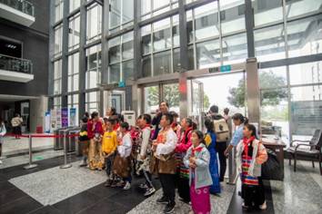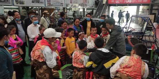 合影留念 仪式结束后,巴塘中小学生师生一行参观了学校易班工作站,在易班工作人员的带领下,简单了解了易班平台、学校易班工作建设情况和成果等,并收到了易班工作站送给大家的礼品——精美的饭盒。同时,师生一行还参观了学校图书馆、创新创业俱乐部、汽车与交通学院实验中心、千人大剧场、音乐与舞蹈学院排练房、高水平运动中心等地,并在校团委组织下参与了趣味纷呈的课外活动。