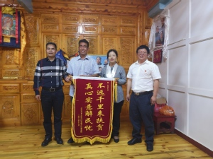 看望贫困户普布 普布赠送锦旗 26日下午,工作组一行前往竹巴龙乡中心校看望在校学生,副校长刘小兵就学生学习和生活上存在的困难进行逐一了解。随后,工作组向竹巴龙乡中心校捐赠校服。捐赠结束后,小朋友围绕“刘叔叔”开心的唱起了歌。