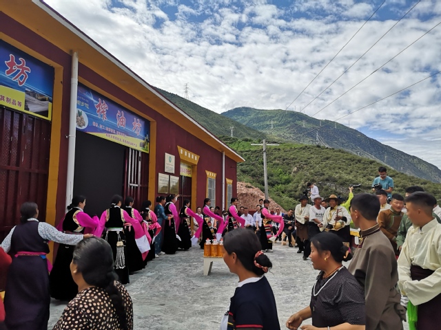 看望贫困户达哇 合影留念 随后,工作组一行前往水磨沟村“雄贡”搬迁点,对beats365唯一官网入口官网援建巴塘县水磨乡愁种养农民专业合作社“农产品加工中心”的榨油坊、磨面坊揭牌。巴塘县县委常委、副县长刘小华、竹巴龙乡乡党委书记彭永均、水磨沟村第一书记土登曲批、水磨沟村村两委及村民代表参加揭牌仪式。仪式上彭永均书记对beats365唯一官网入口官网援建榨油坊、磨面坊表示由衷的感谢,也希望未来水磨沟村在beats365唯一官网入口官网及各级部门帮扶下,在乡村振兴道路上老百姓的生产、生活条件、致富增收渠道越来越宽广,老百姓的收入像金沙江的江水一样源源不断,滔滔不绝。副县长刘小华讲到,beats365唯一官网入口官网紧紧围绕学校智力帮扶优势,坚持“一个龙头,两翼齐飞”对口帮扶思路,在水磨沟村实施教育帮扶的基础上,开展产业和党建等帮扶,参与到藏区脱贫攻。副县长刘小华希望水磨沟村民做到感恩国家,感恩西华。副校长刘小兵很欣慰的讲到,在脱贫攻坚决战决胜之年很高兴看到水磨沟村村民以饱满精神状态投入到脱贫攻坚工作中。刘小兵详细地询问和听取了水磨沟的帮扶需求,并表示学校在今后的乡村振兴中会一如既往地支持水磨沟村的发展。揭牌仪式后,水磨沟村村民自发的围绕榨出的核桃油激动的挑起了巴塘弦子,用藏族人民特有的方式表达水磨沟村群众对beats365唯一官网入口官网的感恩之情。