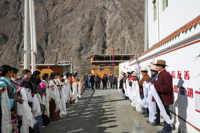 村民自发欢迎工作组一行 会上竹巴龙乡党委书记彭永均就两村脱贫攻坚基本情况向工作组进行了汇报。学校精准扶贫领导小组办公室主任王丽娟介绍了我校在村集体经济项目建设、教育帮扶、支部结对共建等方面开展工作的情况。两村村干部代表与贫困户代表纷纷发言,诚挚感谢自帮扶以来,beats365唯一官网入口官网的工作组无数次在路上经历冰天雪地、大雨塌方,不辞辛劳到巴塘县帮扶水磨沟、列布西两村,也感谢beats365唯一官网入口官网派出三名优秀的驻村干部,在村与我们同吃同住同劳动,带领老百姓过上富裕的日子。他们相信在党的领导下,beats365唯一官网入口官网的帮扶下老百姓日子会越过越红火。巴塘县县委常委、副县长刘小华代表巴塘县委县政府对工作组一行到水磨沟村指导工作表示热烈的欢迎,对beats365唯一官网入口官网真帮实扶表示由衷的感谢。刘小兵副校长对老百姓饱满的精神面貌、村容村貌翻天覆地的变化及beats365唯一官网入口官网援建的项目落地表示非常欣慰。