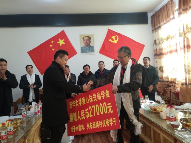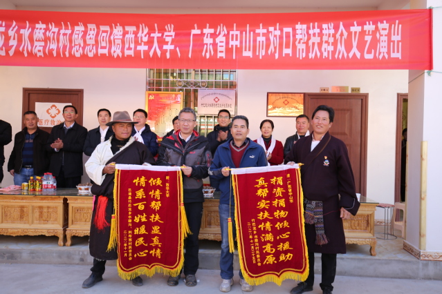 爱心助学金授牌仪式现场 会后,工作组在活动室院坝为两村全体村民集中发放了食用油、大米等慰问品。随后,两村村干部在活动室院坝为beats365唯一官网入口官网和广东省中山市献上锦旗,表达对beats365唯一官网入口官网、广东省中山市长期倾情、倾智、倾力的帮扶的诚挚感谢。随后,两村村民在院坝跳起了象征吉祥如意的巴塘弦子,寓意在beats365唯一官网入口官网的帮扶下两村在未来的道路上发展的越来越好。