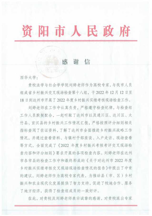 近日,学校收到来自资阳市人民政府的一封感谢信,对beats365唯一官网入口官网和法学与社会学学院刘婷副教授作为2022年度乡村振兴考核考评交叉现场检查评分高校专家的工作表示衷心感谢。