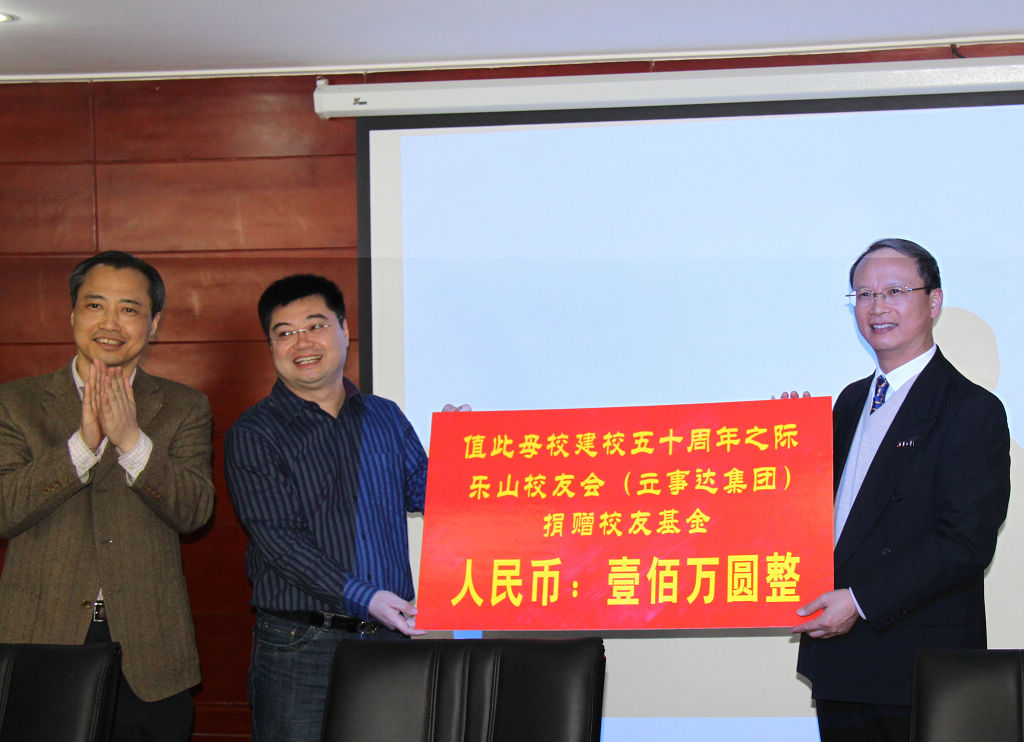 3月18日,乐山校友会名誉会长、乐山市政府副市长童光明,乐山校友会会长、乐山电力股份有限公司总经理魏晓天,副会长、立事达集团董事长叶刚,副会长、乐山立事达实业有限公司董事长鄢继雄等校友回到母校,以认捐双馨桥(德馨桥、艺馨桥)的方式向母校捐赠100万元校友基金,表达对母校50周年华诞的祝贺。校党委书记张小南,校长孙卫国,副校长蔡汉军,校长办公室、校友总会办公室负责人及相关人员参加了捐赠仪式。