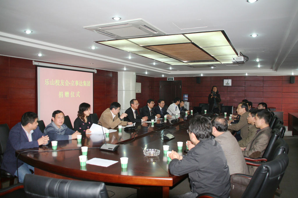 在办公楼212会议室举行的捐赠仪式上,孙卫国校长与魏晓天会长、叶刚副会长签署了捐赠协议书;魏晓天会长、叶刚副会长向孙卫国校长赠送了捐赠牌。接着,蔡汉军副校长分别为乐山校友会和立事达集团颁发了捐赠证书和捐赠纪念品。