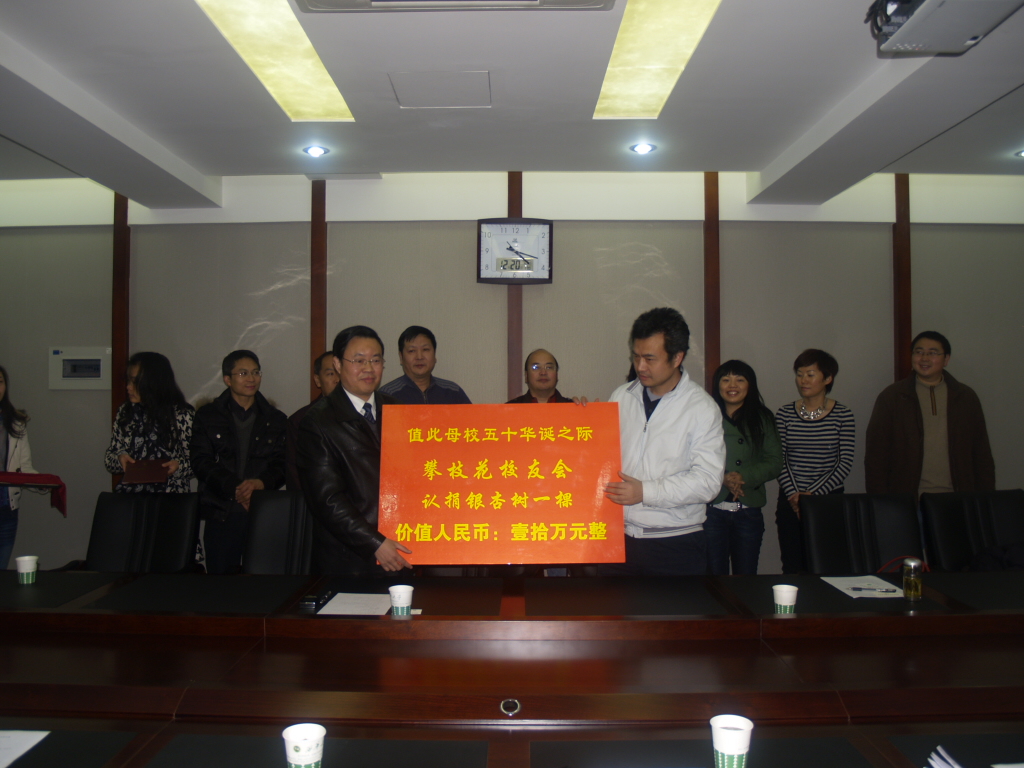 12月20日下午,攀枝花校友会会长潘祖高、副会长王斌、钟伟等校友回到母校,以认捐银杏树的方式,捐赠十万元校友基金,表达对母校生日的祝贺。副校长蔡汉军,校长办公室、校友总会办公室主要负责人及相关人员参加了捐赠仪式。