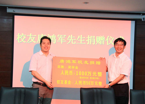 7月15日下午,我校建筑与土木工程学院工民建专业84级校友、四川德居置业有限公司董事长唐鸿军先生捐赠仪式在行政楼212会议室举行。校党委书记张小南,校党委副书记王小林,副校长蔡汉军,校办、地方合作与服务处、宣传部、学工部、人事处、计财处、校团委、建筑与土木工程学院相关负责人以及四川德居置业有限公司副总裁杨涛、行政总监张宾梅参加了捐赠仪式。仪式由王小林主持。 唐鸿军将从今年开始,每年向学校捐赠人民币50万元,设立“唐鸿军奖教金”和“唐鸿军奖学金”,持续20年(自2009年9月1日起至2029年8月31日止),累计人民币1000万元。同时,一次性向校友基金捐赠人民币50万元。 捐赠仪式上,蔡汉军与唐鸿军签署了捐赠协议书,唐鸿军向张书记递交了捐赠牌。随后,王小林、蔡汉军分别为唐鸿军颁发了捐赠证书和捐赠纪念品。 捐赠仪式结束后,唐鸿军发表感言。他表示,母校的培养和教育特别是所学的专业知识对自己的事业有很大的帮助,为自己的成功奠定了坚实的基础。今天,怀着激动的心情和感恩的心回到母校,对母校进行捐赠,并希望能够起到一个抛砖引玉的作用,希望更多的校友一起来关心学校、为母校的发展贡献力量。 张书记代表学校对唐鸿军先生的捐赠表示感谢。他表示,从唐鸿军校友对母亲的捐赠行动可以看到校友对母校的支持和关心。学校培养了人才,同时校友在任何时候都不会忘记学校,校友与学校的血缘纽带关系永远存在。欢迎校友回来参加明年的校庆,并希望校友利用校友总会这个平台,多关心母校,支持母校,同时校友在事业上也会得到母校的帮助与支持。最后,张书记还代表学校表达了对四川德居置业有限公司和唐鸿军先生的美好祝愿。 ![]() 副校长蔡汉军和校友唐鸿军先生签署捐赠协议书