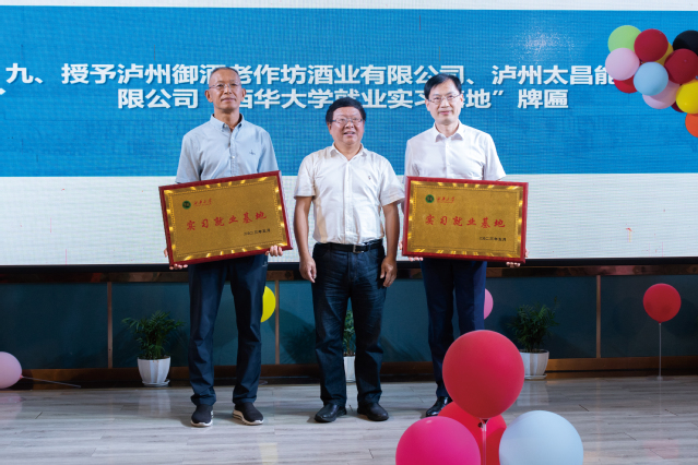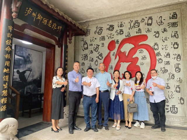 合影留念 会前,刘小兵副校长一行分别走访调研了梁智明校友的企业——泸州御酒老作坊酒业有限公司,宋舸校友的企业——泸州太昌能源有限公司,关心、了解了校友企业的建设发展情况、技术优势,并就学校人才培养、实习实践基地建设、招聘毕业生等工作做了沟通交流。