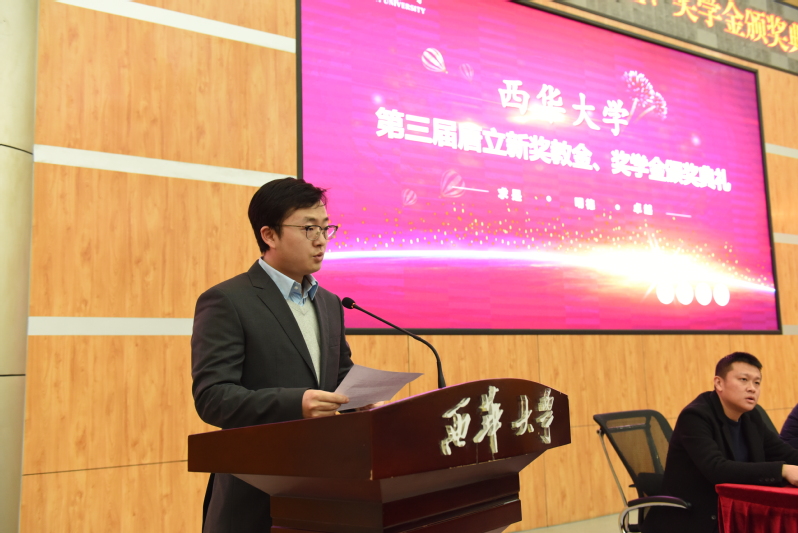 获奖教职工代表经济学院徐雷副教授发言 “唐立新奖学金”获奖学生代表、汽车与交通学院杨文浩代表全体获奖学生对唐立新先生和新尚集团以及学校表达了衷心的感谢,通过回忆自身奋斗经历,他谈到,从全国第十到世界第二,努力、刻苦是自己的代名词,获得唐立新奖学金后自己将更加努力,潜心学习,砥砺前行,用行动诠释“奋斗的青春最美丽”,同时也十分感谢学校给予的平台和机会,定将不忘作为一名西华人的责任与担当。