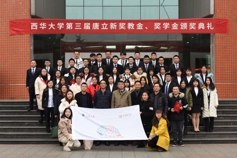 唐立新奖学金获奖者(部分)合影 “唐立新奖教金”获奖教职工代表、经济学院徐雷副教授发言,他首先代表获奖教师向唐立新先生和新尚集团的支持、学校师生的关心和倾情投入、前辈和同仁的扶助、学校的培养表达了衷心感谢。他表示,今后定会将此激励和动力充分传递出去,努力成为教书育人的典范,争做刻苦钻研、严谨笃学、勇于创新的榜样。