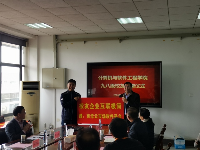 王政书代表学校给校友颁发了捐赠证书,并感谢校友的捐赠。他表示母校取得的成就,凝聚着一代代西华人共同的智慧和汗水,母校未来的发展,更需要全体校友的参与和支持。王政书还就西华云市场软件平台的运维、应用、推广等问题与大家交换了意见。